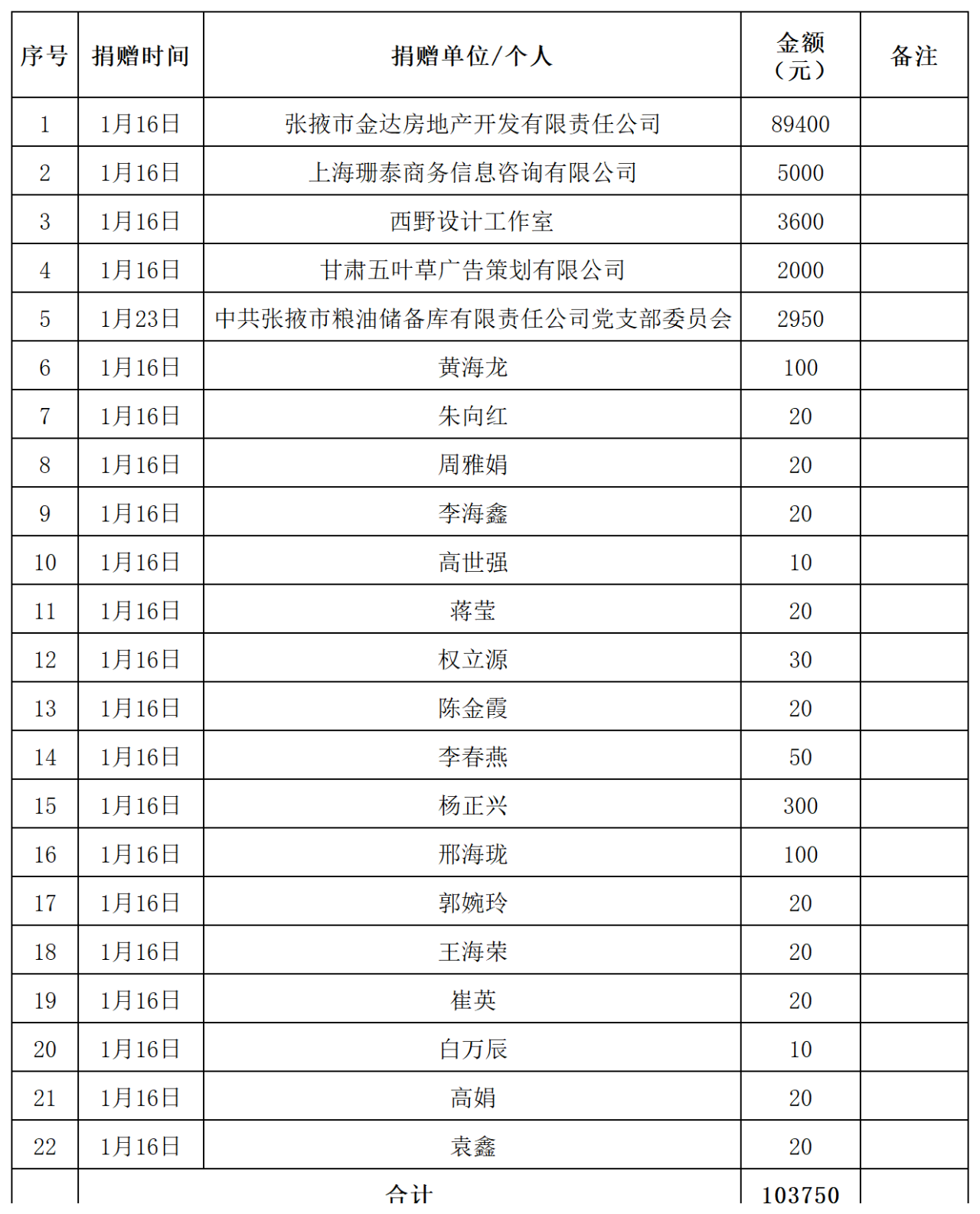 2025年1月7日,西藏日喀則市定日縣發(fā)生6.8級(jí)地震,張掖市慈善協(xié)會(huì)收到愛心單位、人士踴躍捐款捐物,幫助災(zāi)區(qū)人民抗震救災(zāi)和災(zāi)后重建。截至1月26日,接收捐款103750元,現(xiàn)公示如下: